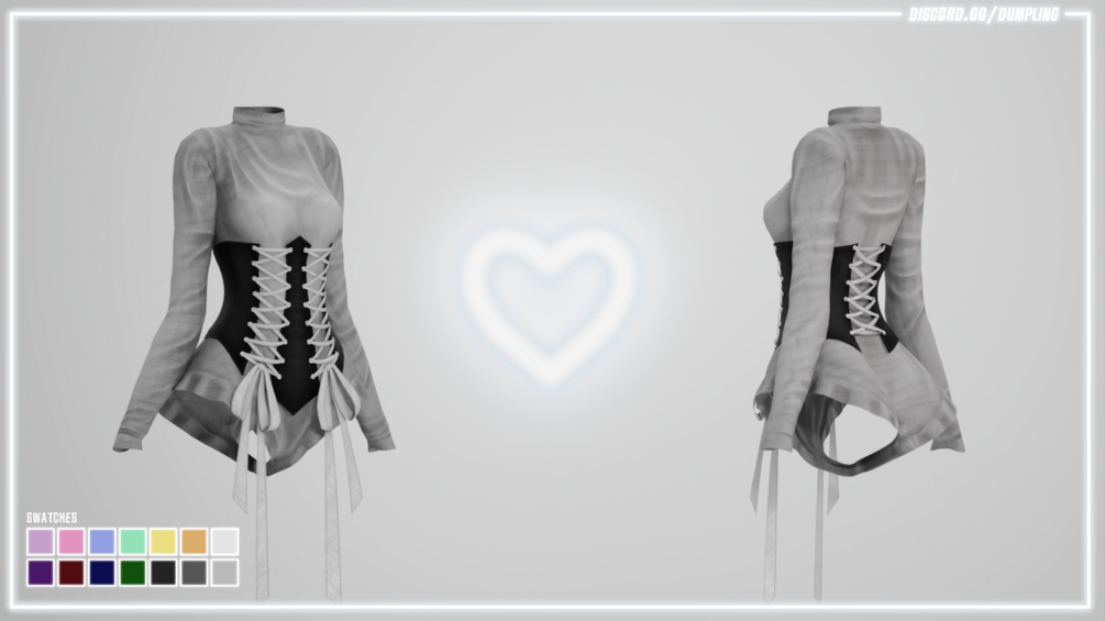 bodysuit & corset made by me in blender and textured in substance painter, two meshes, two materials, 14/29 color variants for bodysuit + black/white corset (texture maps included)